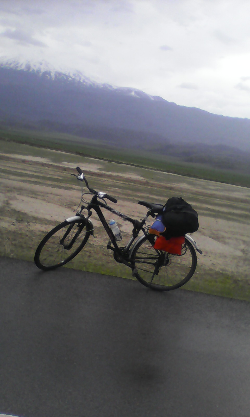 در طرف دیگر جاده خلوت طول صف سه کیلومتری ماشینهای ترانزیت وجود داشت این صف در ان طرف بازرگان هم بود در همان اول باران بسیار شدیدی زد که حتی درون درون کفشهایم را هم خیس کردبا خود فکر میکردم با این بارندگی ها چگونه میتوانم چند روز رکاب بزنم به دلیل اینکه لباس بارانی مناسبی نداشتم شب توی هتل با پلاستیک چیزی شبیه لباس بارانی برای خود درست کردم که البته در طول سفر به کارم امد شب در هتلی در دوبایزید ماندم این شهر اولین شهر بعد از مرز بازرگان میباشد معمولا افرادی که از ایران و کشورهای مختلف برای صعود به آرارات زیبا میایند قبل و یا بعد از صفر برای استراحت و یا آمادگی و گشت و گذار با این شهر می آیند خیابانهای شهر سنگفرش بود و چند متل در آنجا بود مردم اکثرا کرد زبان هستند و خونگرم و کوهنوردان و ورزش دوستان را تحویل میگیرند معمولا برای صحبت و وقت گذراندن به قهوه خانه میروند من چند کلمه شروع این متن را در کافی نت آنجا نوشتم فردا صبح به طرف آغری به راه افتادم هوا بسیار تمیز و مسیر بسیار سر سیز و خلوت بود و جاده کمی شیب مثبت داشت در بین راه از سمت غرب دوچرخه سواری در حرکت بود کمی صحبت کردیم فردی خندان وخوش اخلاق از کشور سویتزلند(سوییس)بود تا استابول را بادوچرخه امده بود وقصد ورود به ایران راداشت و از ایران به ازبکستان و چین ...از بارندگی و باد وسردی هوا در مسیر گله میکرد ومن به او گفتم در عوض در ایران با هوایی گرم مواجه خواهی شد. نقشه ترکیه را که دیگر احتیاجی نداشت به من هدیه داد...بعد از 86کیلومتر رکاب زدن به آغری رسیدم شهری نسبتا کوچک مرکز استان آغری مردم اکثرا کرد دارای یک سینما. دانشگاه و آماده برای سفر نخست وزیر رجب طیب اردوغان برای تبلیغ حزبش جهت انتخابات مجلس . در کل مسیر 550 کیلومتری هیچ عکسی از شخصیتهای سیاسی ترکیه در کنار جاده ندبدم و کلا باوجود گرانی سوخت و سختی زندگی نظم خاصی حاکم بود